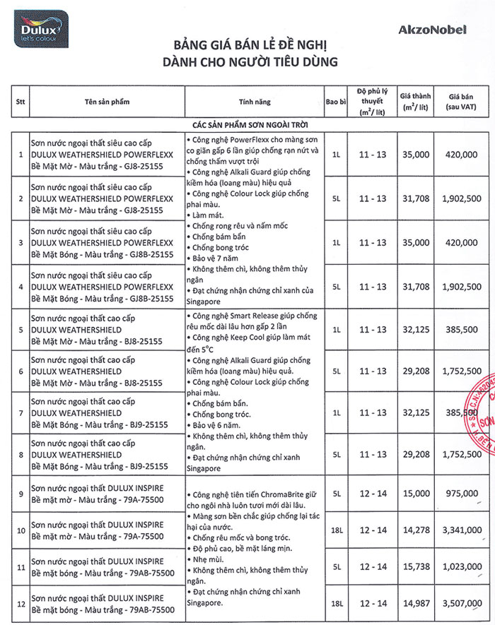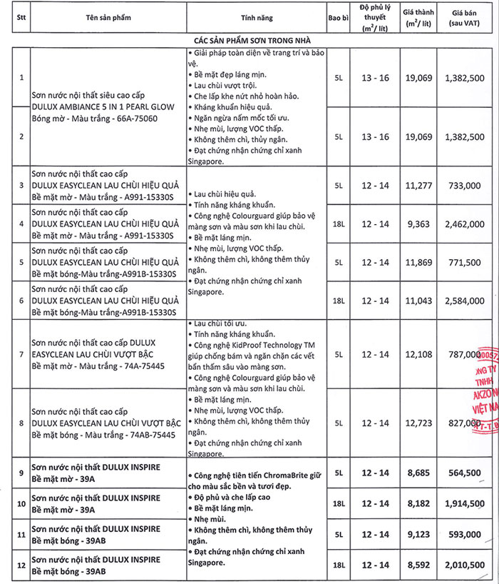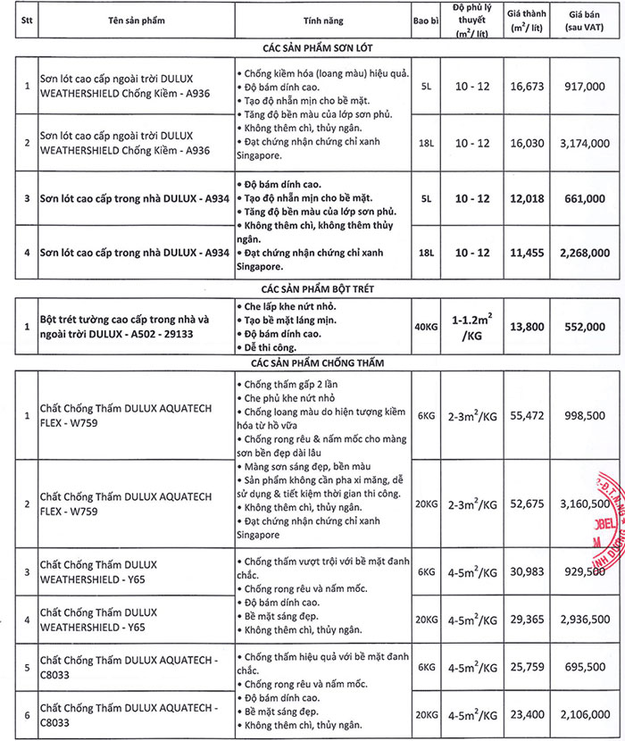 Giá thanh toán sẽ thấp hơn báo giá niêm yết của nhà sản xuất mà chúng tôi đăng tải bên dưới. Khách hàng có nhu cầu sử dụng sơn Dulux, liên hệ ngay Nhà phân phối sơn Dulux chính hãng tại Công ty Thiên Hồng Ân để mua hàng chính hãng và nhận được báo giá chiết khấu sơn Dulux tốt nhất. Dưới đây là bảng giá sơn Dulux mới nhất hiện nay dành cho người tiêu dùng.