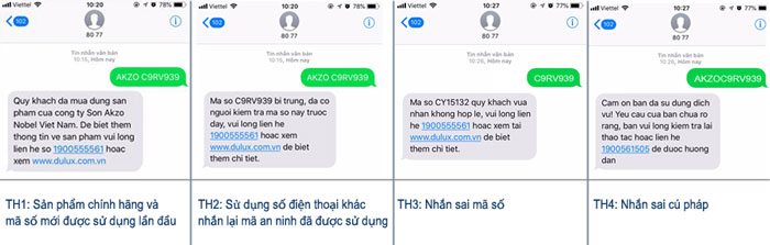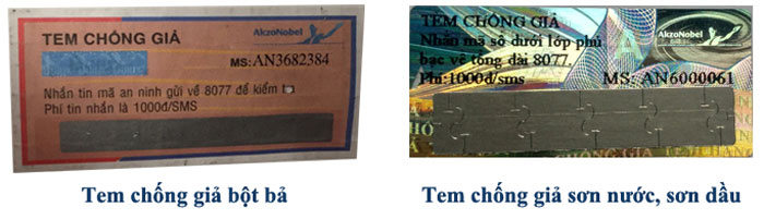 – Đối với tem trên sản phẩm sơn nước và sơn dầu cách nhận biết hàng chính hãng là nhẳn tin về tổng đài 8077.