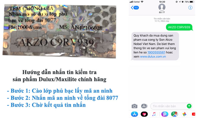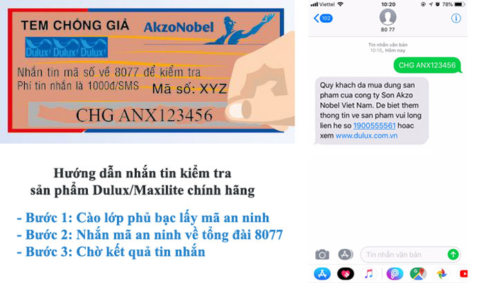 Dulux và Maxilite là những nhãn bột trét tường duy nhất tại Việt Nam có công cụ để người tiêu dùng kiểm tra sản phẩm chính hãng bằng tin nhắn.