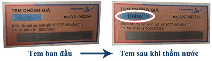 Cách 1: Kiểm tra nhanh chóng, đơn giản và dễ dàng bằng nước thấm lên phần logo Dulux màu xanh trên tem.