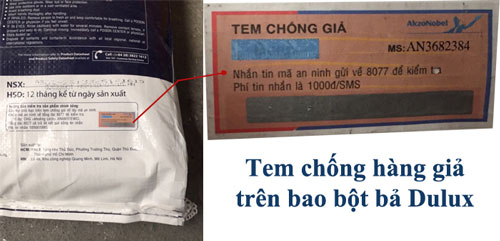 a. Vị trí dán tem chống giả trên bao bột bả Dulux