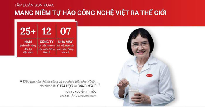 Sơn Kova chính là dòng sản phẩm của Tập đoàn Sơn Kova – một hãng sơn do người Việt Nam nghiên cứu và sản xuất đó chính là PGS. TS NGUYỄN THỊ HÒE. Các sản phẩm Sơn Kova đáp ứng được điều kiện khí hậu nhiệt đới gió mùa tại Việt Nam, trở thành nguyên vật liệu sử dụng rất phổ biến trong các công trình xây dựng.