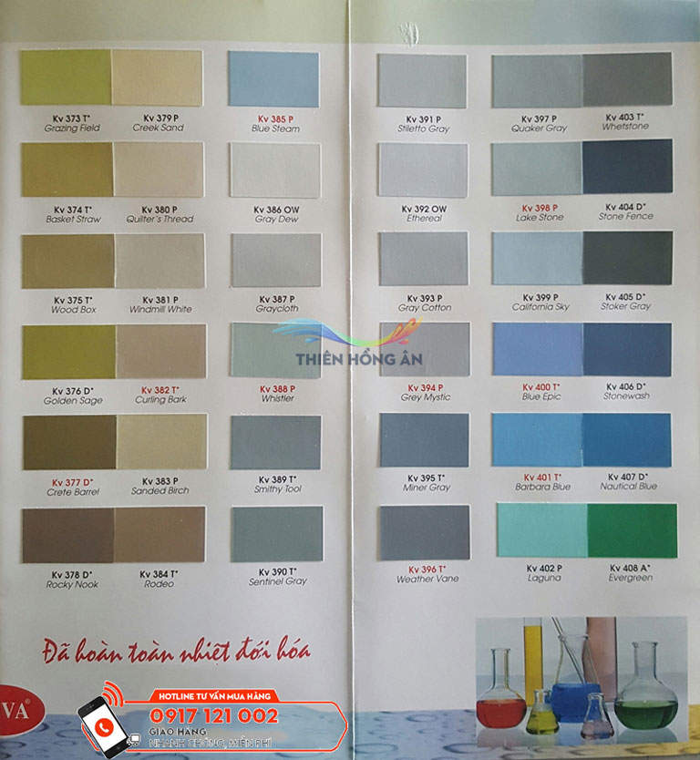 Hi vọng rằng với Bảng màu sơn nước Kova trên sẽ giúp ích được cho quý khách. Nếu quý khách có bất kỳ thắc mắc gì cần giải đáp hay có nhu cầu quan tâm đến dịch vụ của Công Ty Sơn Thiên Hồng Ân. Hãy liên hệ ngay cho chúng tôi qua đường dây nóng hotline: 0917 121 002 hoặc 0938 197 594