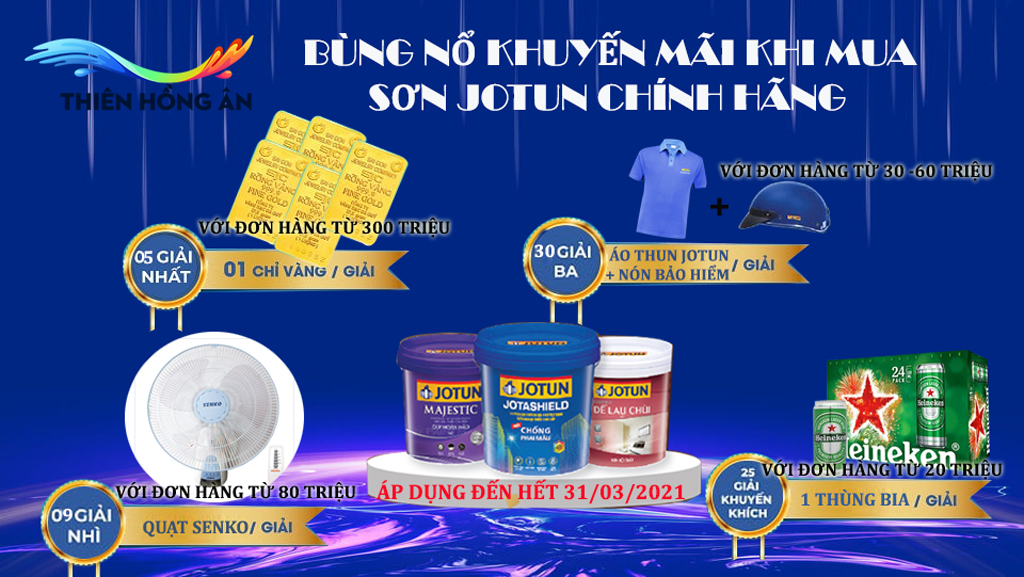 1. Khi mua đơn hàng sơn nước Jotun chính hãng với đơn hàng 300 triệu đồng ==> Quý khách hàng sẽ được nhận ngay 1 chỉ vàng SJC 9999 liền tay.