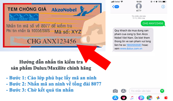 Để nhận biết sơn Kova thật, quý khách hàng cần cào lớp tráng bạc trên mặt tem để lấy mã số xác thực, sau đó nhắn tin theo cú pháp “KOVA (dấu cách) mã số xác thực” gửi về tổng đài 8077. Ngay lập tức, tổng đài sẽ trả về tin nhắn hồi đáp.