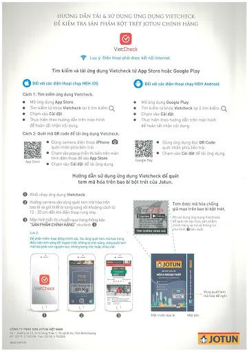 Nhằm đảm bảo quyền lợi của khách hàng: được mua và sử dụng sản phẩm chính hãng. Jotun Việt Nam hướng dẫn tải ứng dụng Vietcheck để kiểm tra sản phẩm bột bả. Hãy luôn là người tiêu dùng thông thái, chỉ với một bước kiểm tra đơn giản. Ứng dụng rất dễ sử dụng.
