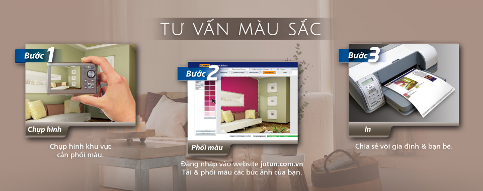 Quý khách hàng vui lòng thực hiện 3 bước sau để nhận được Bản phối màu Sơn Jotun 3D đẹp nhất cho ngôi nhà của mình